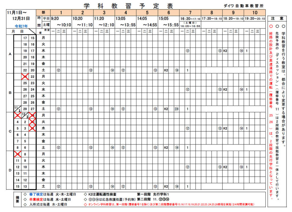 【令和7年11月1日~】学科教習予定表を更新しました