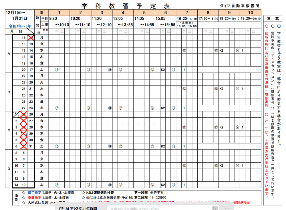 【令和7年12月1日~】学科教習予定表を更新しました
