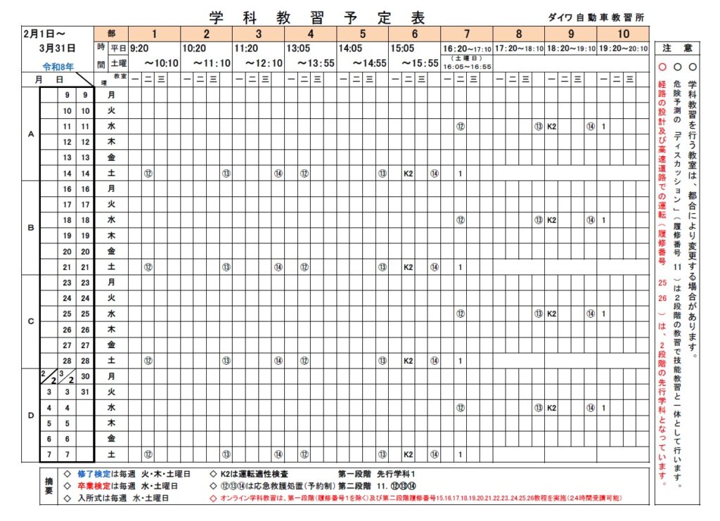 【令和8年2月1日~】学科教習予定表を更新しました