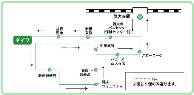 教習所 発中里歯科政津郵便局開成 コミュニティハウス金岡 交差点ハピーズ 西大寺店ハローワーク西大寺駅西大寺バス センター新橋東側益野団地教習所 着 17:558:048:158:198:248:258:288:318:338:378:45 210:3010:4010:4110:4210:4510:4810:5010:5411:00 311:1511:2411:3011:3411:3911:4011:4311:4611:4811:5212:00 412:4012:4912:5512:5913:0413:0513:0813:1113:1313:1713:25 515:0015:1015:1115:1215:1515:1815:2015:2415:30 6※16:0516:1416:2016:2416:2916:3016:3316:3616:3816:4216:50 7※20:15(送りのみ) 教習所 発中里歯科政津郵便局開成 コミュニティハウス金岡 交差点ハピーズ 西大寺店ハローワーク西大寺駅西大寺バス センター新橋東側益野団地教習所 着 17:558:048:158:198:248:258:288:318:338:378:45 210:3010:4010:4110:4210:4510:4810:5010:5411:00 311:1511:2411:3011:3411:3911:4011:4311:4611:4811:5212:00 412:4012:4912:5512:5913:0413:0513:0813:1113:1313:1713:25 515:0015:1015:1115:1215:1515:1815:2015:2415:30 6※16:0516:1416:2016:2416:2916:3016:3316:3616:3816:4216:50 7※20:15(送りのみ) ※ 6、7便は土曜日は運休です。土曜日の最終便は、17:05に教習所を出発します。
